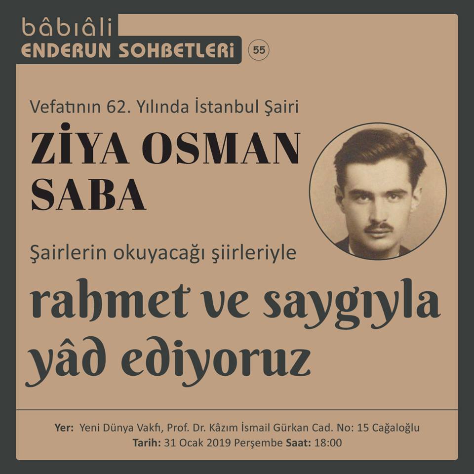 Cumhuriyet devri Türk edebiyatının sevilen ve unutulmayan şair ve yazarı Ziya Osman Saba, vefatının 62. Yıldönümünde Bâbıâli Enderun Sohbetleri’nde yâd ediliyor. Yeni Dünya Vakfı Genel Merkezi’nde gerçekleşecek olan anma toplantısında Saba’yı, şairler anlatacak ve şiirlerini okuyacaklar. Kendine özgü bir üslubu, farklı, lirik, özgün ve naif kişiliği ile hatırlanan Ziya Osman Saba, şiirlerinde, hikâyelerinde ve denemelerinde İstanbul sevgisini, unuttuğumuz değerleri bize hatırlatan bir edebiyatçı olarak biliniyor. Katılımın serbest olduğu anma toplantısı, 31 Ocak Perşembe günü saat 18.00’de başlayacak. Adres: Prof. Dr. Kâzım İsmail Gürkan Caddesi, No: 15 Cağaloğlu.